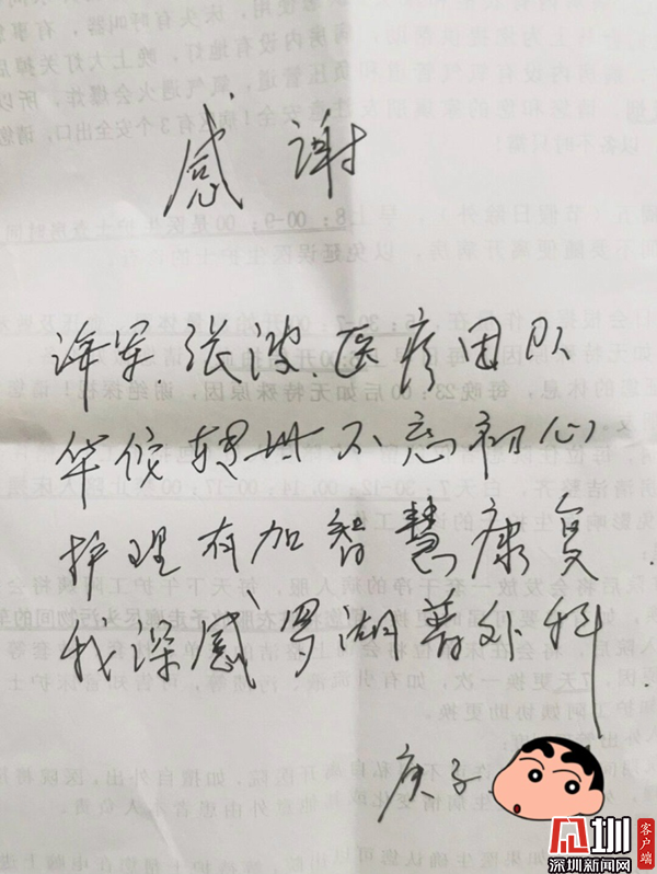 深圳新聞網(wǎng)訊(見圳客戶端、深圳新聞網(wǎng)記者 郭含笑 通訊員 許陽)日前,羅湖醫(yī)院普外科收到了一封來自患者的親筆感謝信,雖然用紙普通,內(nèi)容簡(jiǎn)單,但字里行間無不流露出寫信人的感激之情。