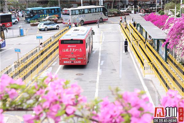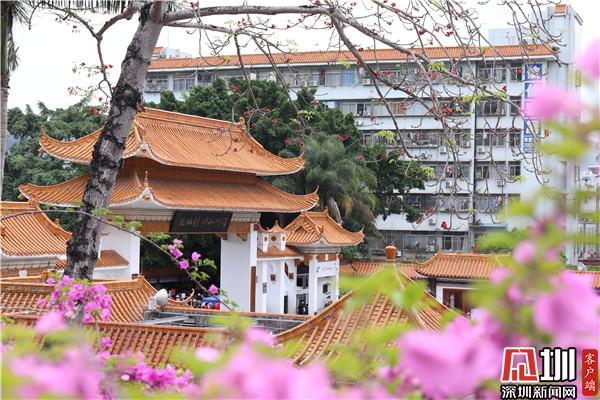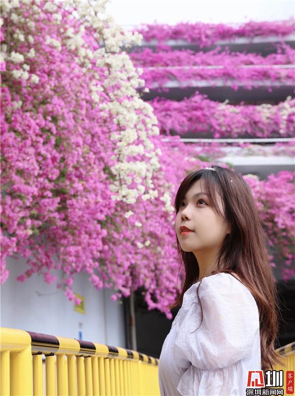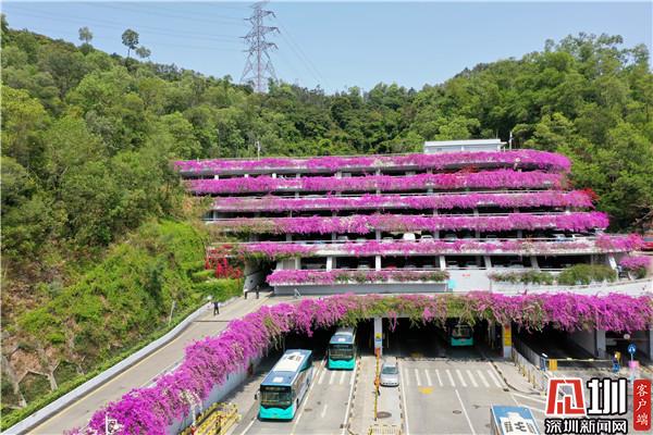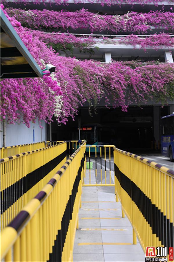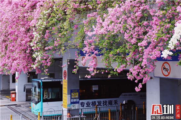 三月末,春深處,粉紫色的花朵環(huán)繞著停車場肆意綻放,與深圳藍(lán)相映成趣。