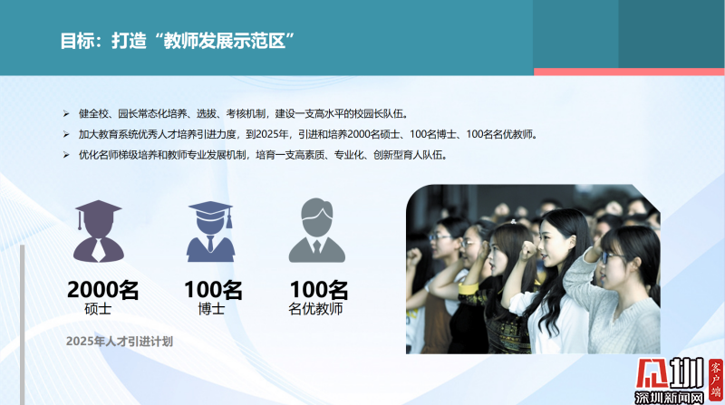 在人才隊(duì)伍方面,實(shí)施“領(lǐng)鷹工程”,建設(shè)一支高水平的校園長隊(duì)伍。優(yōu)化名師梯級(jí)培養(yǎng)和教師專業(yè)發(fā)展機(jī)制,培育一支高素質(zhì)、專業(yè)化、創(chuàng)新型育人隊(duì)伍。到2025年,羅湖將引進(jìn)和培養(yǎng)2000名碩士、100名博士、100名名優(yōu)教師,建立教科研博士工作站。
