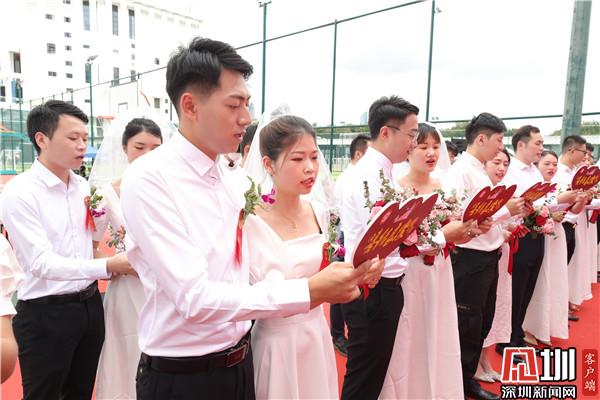 新郎身穿白襯衣,新娘身著潔白婚紗,他們十指緊扣,笑容甜蜜,在眾人的見證下交宣讀誓言、深情擁吻,許下一生愛的承諾。羅湖區(qū)副區(qū)長馮健和羅湖區(qū)民政局局長楊文秀作為特邀頒證師,分別為20對新人頒發(fā)結(jié)婚證書并送上誠摯的祝福,新人們的歡聲笑語充滿了婚姻登記處的每個角落,處處洋溢著幸福與喜悅。通過集體頒證莊嚴而神圣的儀式感,向新人們強調(diào)法律的嚴肅性和婚姻的莊嚴性,讓他們銘記婚姻家庭蘊含的責任與擔當,同時倡導廣大市民樹立“重登記、強責任、崇節(jié)儉”的婚俗新風意識,形成婚事新辦、簡辦的文明新風尚。