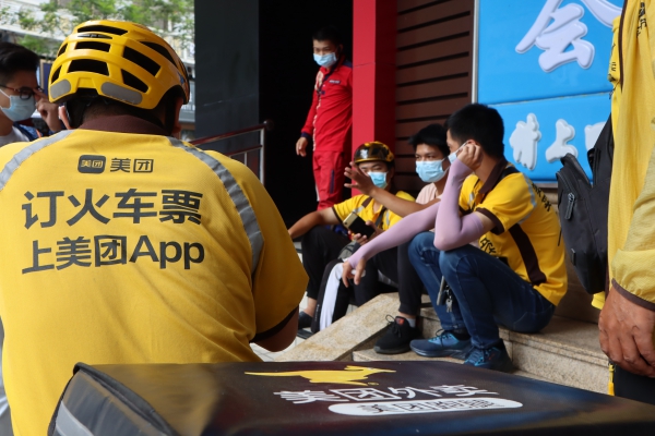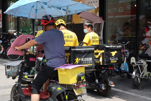 記者看到,街道上像呂先生這樣的外賣員數(shù)量不在少數(shù),短短十幾分鐘,記者就看到了近百名外賣員、派送員穿行街頭,將訂單送達(dá)客戶手中。他們趁取餐時間,在餐廳門口休息,不少人直接席地而坐,享受一下開放餐廳流出的一絲冷氣。