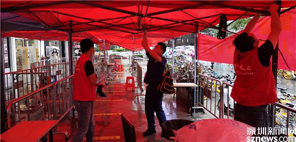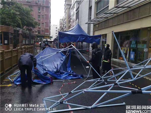 6月22日早上,黃貝街道工作人員在風(fēng)雨中搭建核酸檢測點帳篷。