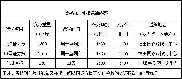 深圳報(bào)業(yè)集團(tuán)印務(wù)有限公司現(xiàn)承印外報(bào)主要有上海證券報(bào)、中國(guó)證券報(bào)、羊城晚報(bào)等重要報(bào)刊,根據(jù)各報(bào)刊的具體要求,安全、準(zhǔn)時(shí)、保質(zhì)、保量地運(yùn)送每天生產(chǎn)發(fā)行數(shù)量的各報(bào)刊到指定地點(diǎn)或客戶(hù)手中,具體運(yùn)輸發(fā)行內(nèi)容和標(biāo)準(zhǔn)詳見(jiàn)下面表格。