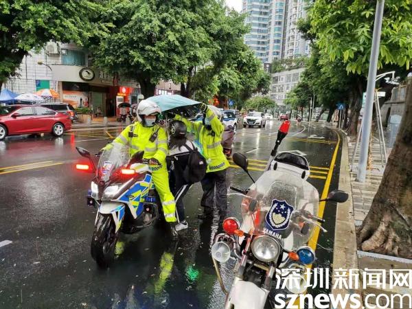 據(jù)了解,為確保大雨天氣下此次中考安全順利進行,羅湖交警大隊高度重視,提前上崗,全力組織轄區(qū)警力疏導各考場周邊交通,并加強駐點值守和執(zhí)勤保障,以及時為有需要的考生及家長提供幫助。