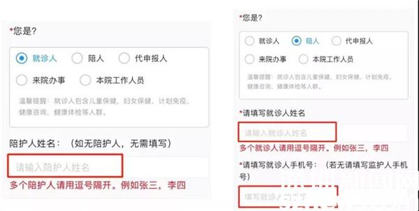 1、填寫本人信息后選擇身份,按照要求填寫陪護(hù)人或就診人信息。