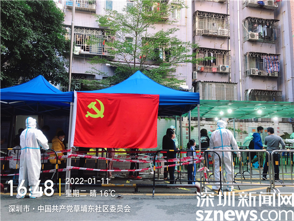黨旗在羅湖區(qū)東曉街道草埔東社區(qū)嚇圍核酸檢測點(diǎn)高高飄揚(yáng)。