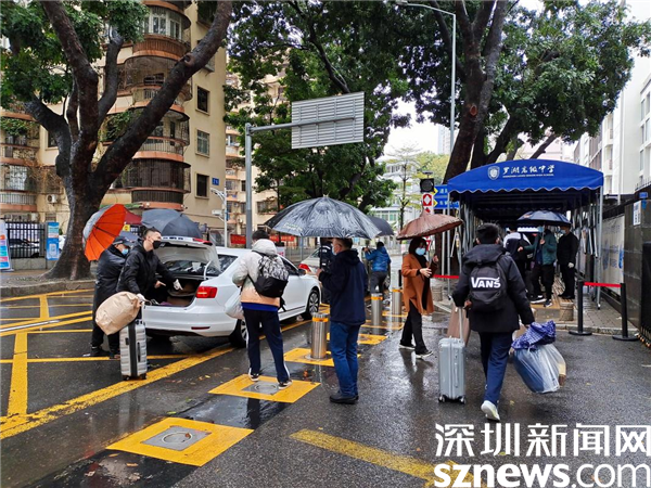 上午8:00左右,深圳市羅湖高級(jí)中學(xué)高三學(xué)子陸續(xù)返校。大雨雖然下個(gè)不停,但是學(xué)生們返校的心情卻絲毫沒有受到影響。在校門口,老師、學(xué)校物業(yè)工作人員為學(xué)生們撐傘、對(duì)行李進(jìn)行消毒、協(xié)助掃碼填報(bào)信息,有序幫助學(xué)生接過行李并用小推車運(yùn)送至宿舍樓?!斑@次開學(xué)和以往開學(xué)有所不同,我的感觸也很深。下著大雨,老師們忙前忙后為我們運(yùn)送行李,覺得非常感動(dòng)?!绷_湖高級(jí)中學(xué)高三學(xué)子張睿說道。
