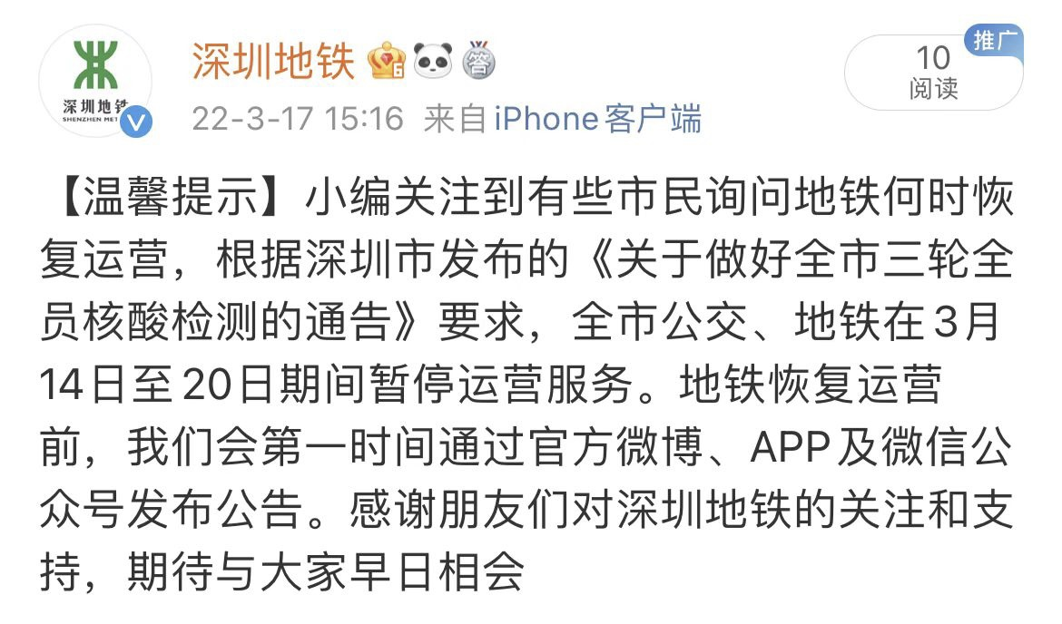 對(duì)此,記者向深圳地鐵求證,深圳地鐵表示,根據(jù)深圳市發(fā)布的《關(guān)于做好全市三輪全員核酸檢測的通告》要求,全市公交、地鐵在3月14日至20日期間暫停運(yùn)營服務(wù)。地鐵恢復(fù)運(yùn)營前,深圳地鐵會(huì)第一時(shí)間通過官方微博、APP及微信公眾號(hào)發(fā)布公告。
