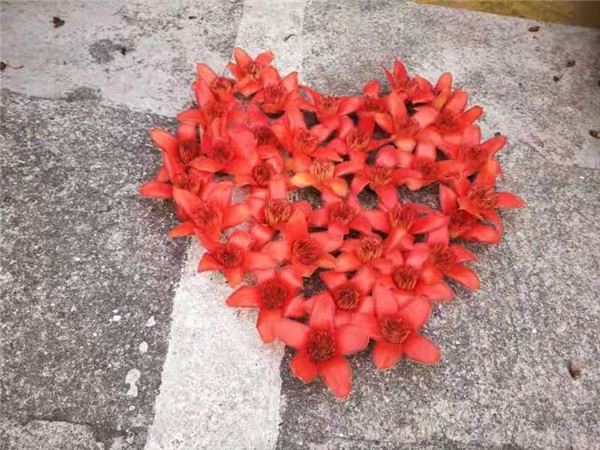 可等到第二次站在樓上時,我大吃一驚……原來,在落英繽紛的路上,出現(xiàn)了幾個紅色的大字。木棉花平整地躺在地上,花瓣朝向天空,排列成“大白加油”四個大字!一旁,則是愛心,則是笑臉。那些小孩子開心地站在一邊,臉上滿是燦爛的笑容,好像空中金色的陽光一樣,時時閃現(xiàn)在我心頭……