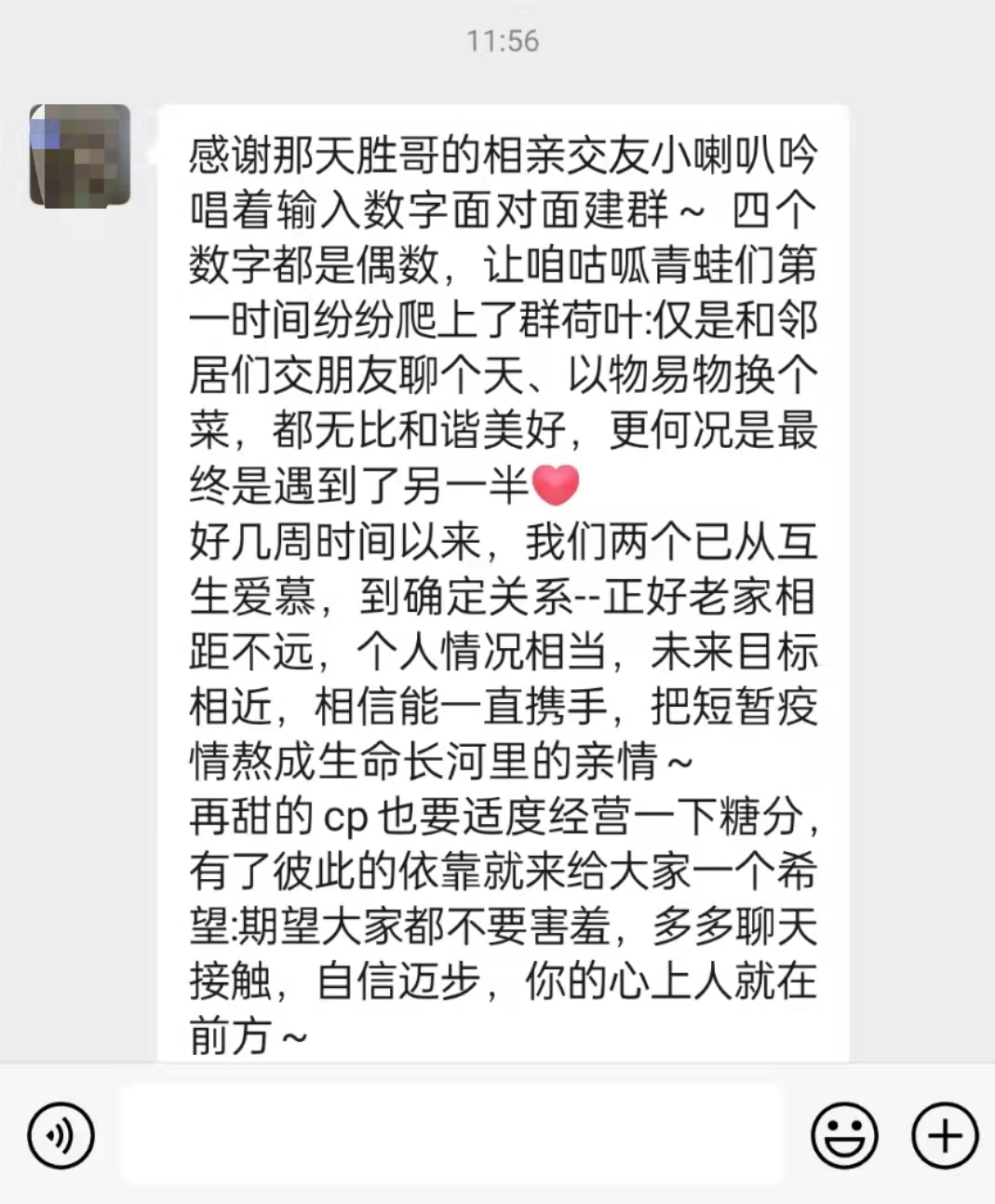 一開始單身交友群只有一個,慢慢地周邊社區(qū)越來越多人加入,群聊數(shù)量增加到了十個。由于群信息互不相通,王勝在每天做完工作后,轉(zhuǎn)發(fā)各單身青年的個人介紹、照片以及擇偶標準到十個群里,有時發(fā)成語接龍的小游戲活躍氣氛。“群里的單身青年們非常積極,大家都喜歡這種模式。我沒事的時候也經(jīng)常和他們聊聊天,讓大家隔離期間?!蓖鮿僬f。