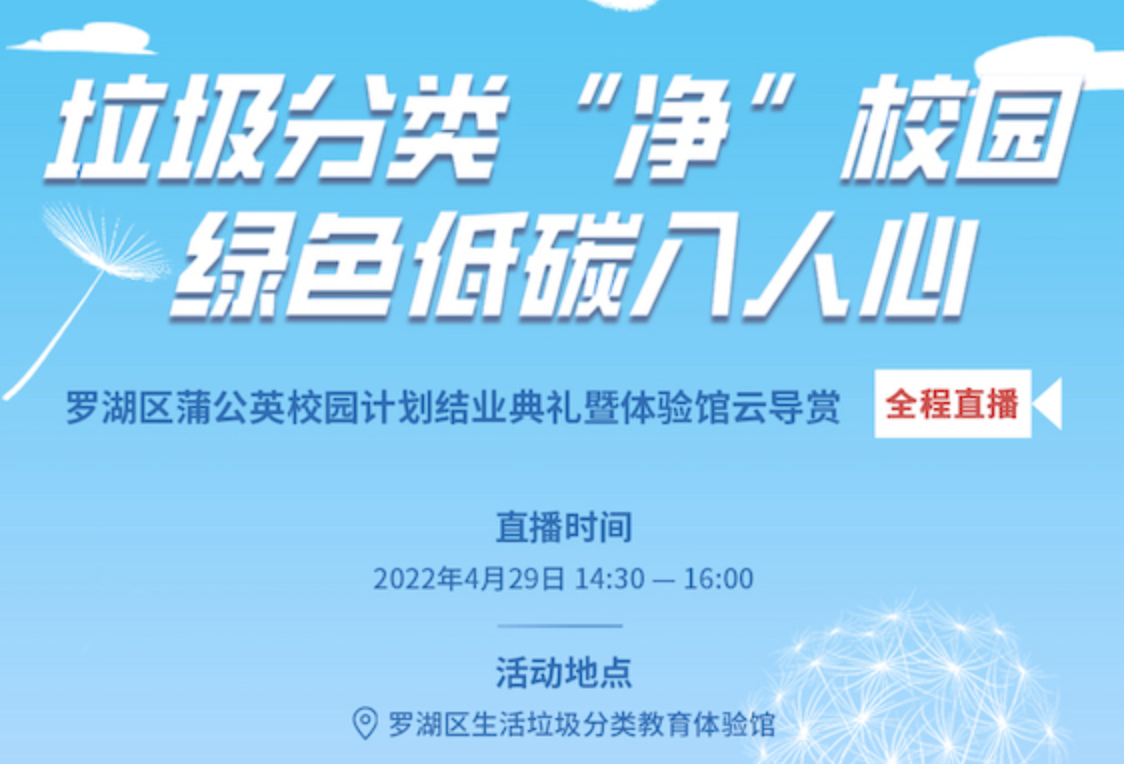 4月29日下午2:30—4:00,羅湖區(qū)首期蒲公英教師培訓(xùn)迎來結(jié)業(yè),羅湖區(qū)垃圾分類體驗館館經(jīng)歷多月重整布展后煥新重開,屆時,深圳市生活垃圾分類管理事務(wù)中心、羅湖區(qū)城市管理和綜合執(zhí)法局和羅湖區(qū)教育局共同舉辦垃圾分類“凈”校園綠色低碳入人心——羅湖區(qū)蒲公英校園計劃結(jié)業(yè)典禮暨科普館云導(dǎo)賞活動,深圳新聞網(wǎng)將進(jìn)行全程直播,歡迎各位網(wǎng)友觀看。