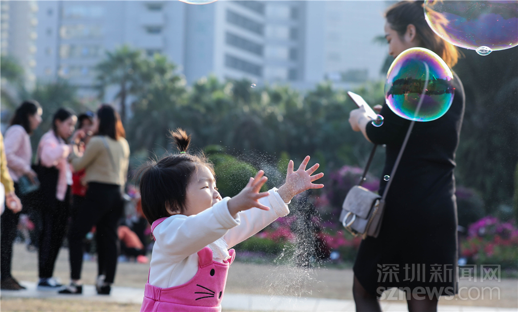 孩子在廣場(chǎng)上追著泡泡開心地玩耍著