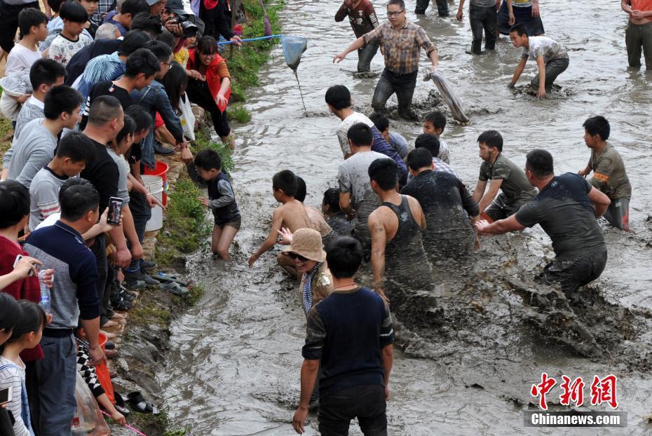3月17日,福建省龍巖市連城縣莒溪鎮(zhèn)璧洲古村落內(nèi),一場“抓魚鬧春田”的活動(dòng)吸引了許多市民前來參與。圖為民眾在泥塘的渾水中抓魚。中新社記者 張斌 攝