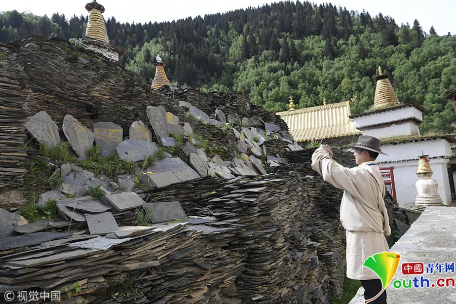 在四川阿壩州壤塘縣棒托寺內珍藏約50萬片明清時期鐫刻的大藏經(jīng)《甘珠爾》和《丹珠爾》,大藏經(jīng)左高9.7米,右高9.2米,長46米、左寬160米,右寬13米,占地598平方米,是目前全世界保存最完整、規(guī)模最宏大、內容最豐富的石刻大藏經(jīng)孤品。據(jù)史料記載,由明末清初60余名石匠辛勤鐫刻9年而成。石刻藏文經(jīng)書圖文并茂,筆法流暢,疏密有致,陰陽相背,滿版生輝。具有極高的文物和藝術研究價值。圖為堆積的石刻大藏經(jīng)孤品。圖片作者/視覺中國