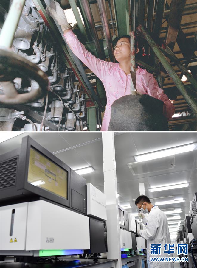 拼版照片:上圖為工人在位于深圳大鵬灣的一家染廠工作(資料照片,新華社記者楊紹明攝);下圖為2017年7月13日,工作人員在國(guó)家基因庫(kù)操作基因測(cè)序儀(新華社記者毛思倩攝)。建設(shè)于大鵬灣畔的深圳國(guó)家基因庫(kù)于2011年由國(guó)家發(fā)改委等部委批復(fù),2016年9月22日正式開業(yè)。新華社發(fā)