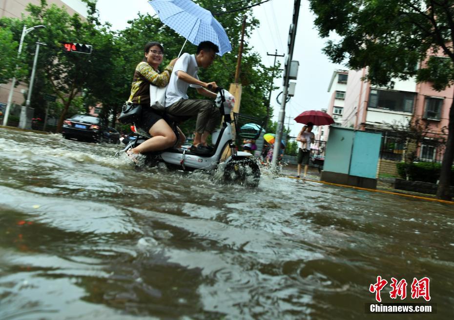 7月16日下午,河北石家莊一條馬路積水嚴(yán)重,民眾涉水騎行。當(dāng)日,該省氣象臺發(fā)布暴雨藍色預(yù)警,承德、雄安新區(qū)、廊坊北部、石家莊中西部、邢臺西部等多地遭受暴雨襲擊。中新社記者翟羽佳 攝