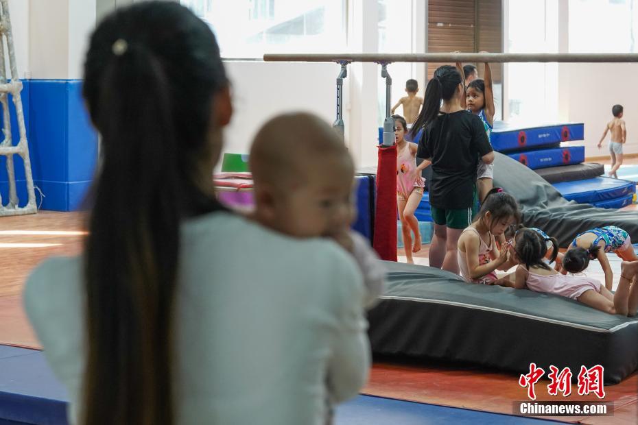 7月16日,貴州榕江,一位母親抱著孩子在訓練室門外看著孩子們訓練。位于月亮山深處的貴州省黔東南苗族侗族自治州榕江縣,數(shù)十年來堅持少年兒童體操培養(yǎng)、訓練,對于全縣有良好身體條件的少年兒童進行免費集中培訓。目前該縣每年有60余名兒童在業(yè)余體操運動學校進行訓練。炎炎夏日,孩子們不懼酷暑,刻苦訓練追尋著自己的“體操夢”。據(jù)了解,自1972年以來,榕江縣先后向貴州省體操隊、蹦床隊輸送了21名運動員;其中有6名運動員進入國家體操隊,10名運動員榮獲“國家健將級運動員”稱號,5名運動員榮獲“國際健將級運動員”稱號,其中體操名將劉榕冰是2014年體操世錦賽男團冠軍成員之一。2004年,榕江縣被貴州省體育局授予“貴州體操之鄉(xiāng)”稱號。中新社記者賀俊怡 攝