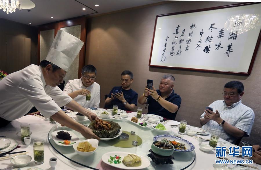 杭州酒家老板吳瑞康現(xiàn)場制作本店招牌菜“叫化雞”(6月16日攝)。 金庸在武俠小說《神雕俠侶》中借郭靖之口說過: “為國為民,俠之大者。”武俠精神在香港備受推崇,有其心向中華文化的情感基礎。在這個國際美食之都,品味舌尖上的武俠味,內中的感覺別有深意。新華社記者 李鵬 攝