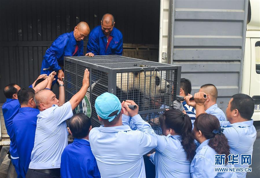 8月20日,工作人員將大熊貓?zhí)锨巴鶛C(jī)場(chǎng)的運(yùn)輸車。 新華社記者 許暢 攝