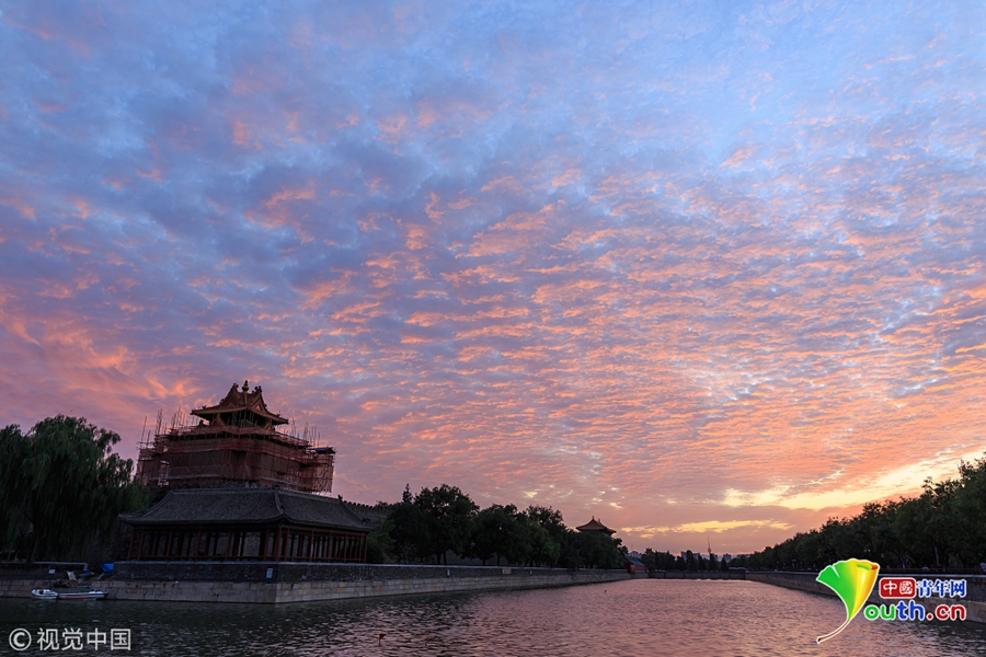 2018年9月5日,北京迎晴好天氣,傍晚時(shí)分,落日晚霞美不勝收。天空出現(xiàn)美麗的火燒云,映照故宮博物院角樓。圖片來(lái)源:視覺(jué)中國(guó)