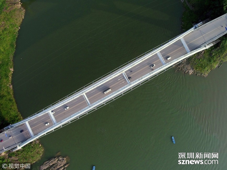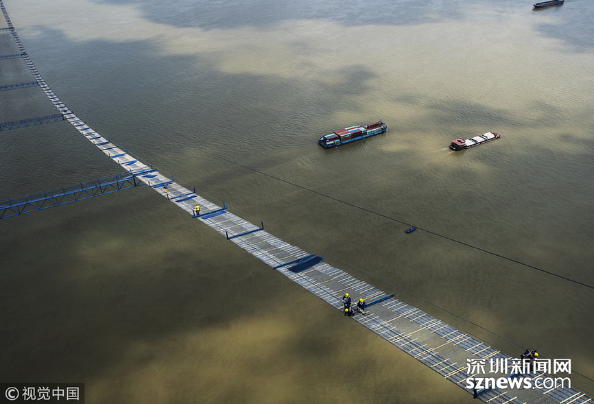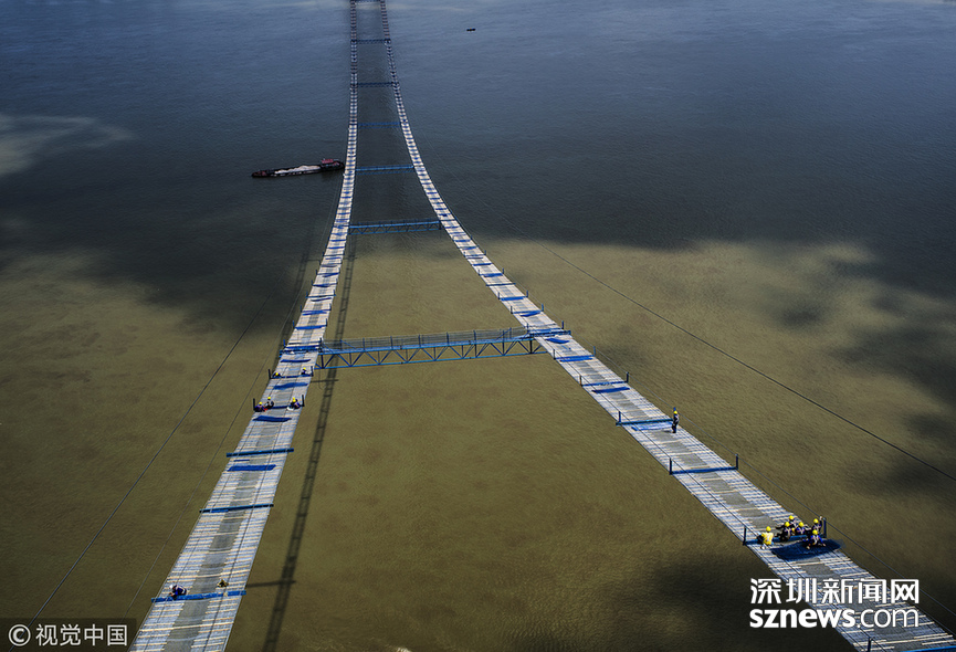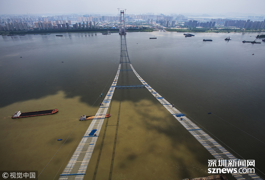 2018年5月14日,武漢,武漢楊泗港長江大橋上空,上部結(jié)構(gòu)施工進入貓道面網(wǎng)鋪設階段,數(shù)十名中鐵大橋局工人在跨江高空拼搏趕超,江面上空的臨時“吊橋”悄然形成。數(shù)十名工人在長江上空228米處拼搏趕超,臨時“天梯”悄然形成。