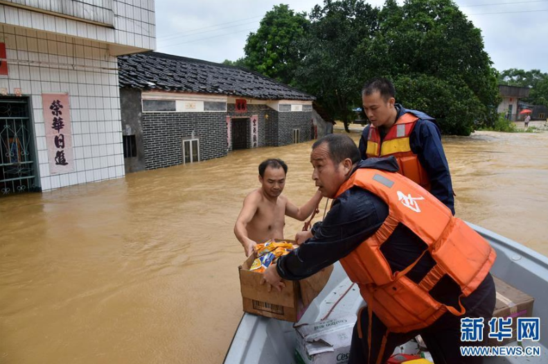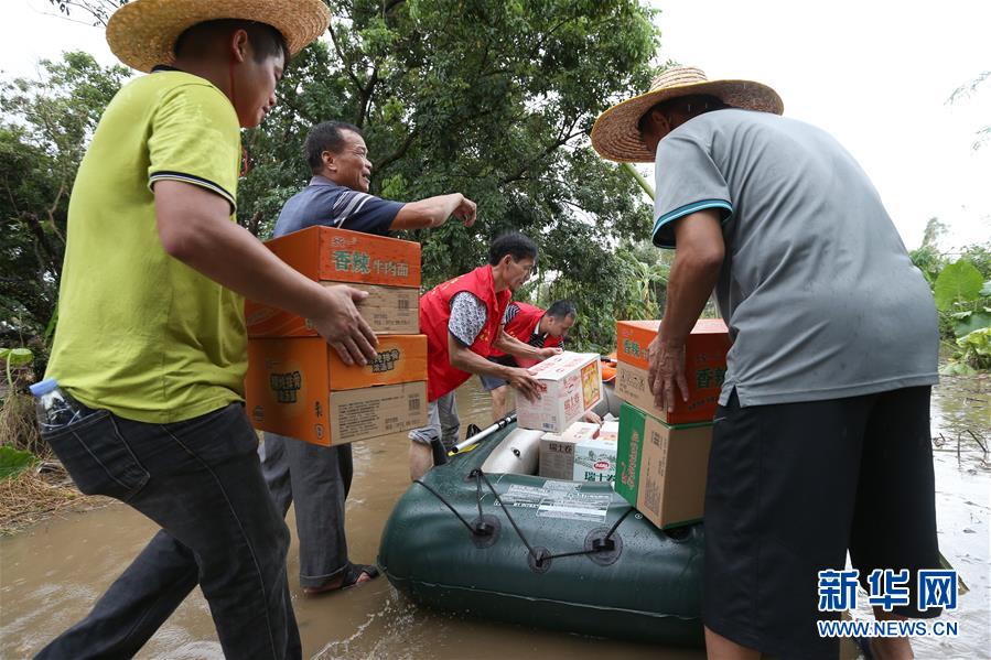 9月18日,在廣東省陽江市陽春市,人們把食物搬運到筏子上,準備分發(fā)給受困村民。 新華社記者張加揚攝