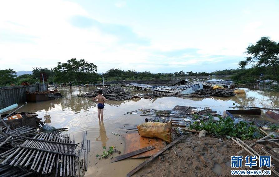 9月18日,在廣東省陽江市陽春市,一名兒童站在水浸的村莊里。 新華社記者張加揚攝