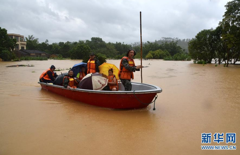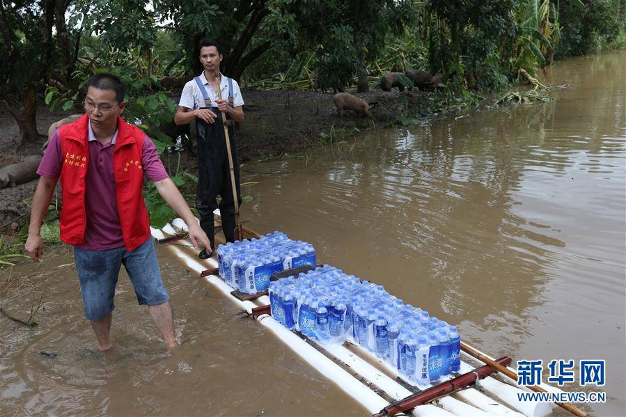 9月18日,在廣東省陽江市陽春市,人們用筏子運送飲用水。 新華社記者張加揚攝
