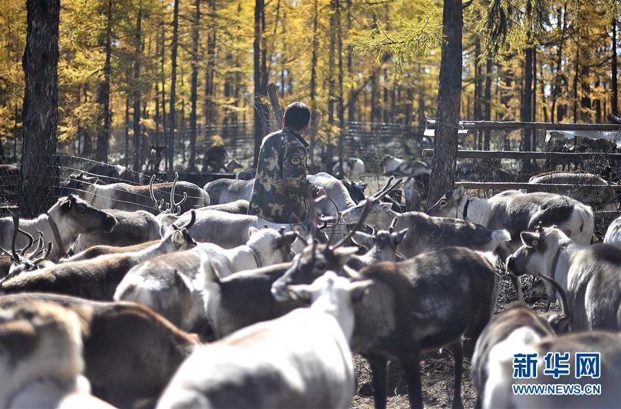 9月18日,在內(nèi)蒙古大興安嶺根河林業(yè)局約安里林場,林場職工張國華要為馴鹿補(bǔ)充飼料。