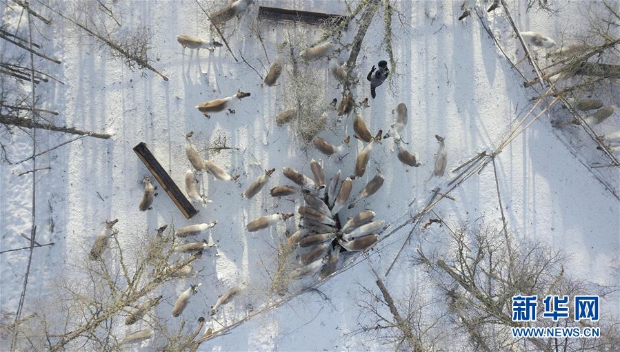 在內(nèi)蒙古大興安嶺根河林業(yè)局約安里林場,林場職工張國華在鹿圈補(bǔ)充飼料(2017年12月23日無人機(jī)拍攝)。新華社記者李任滋攝