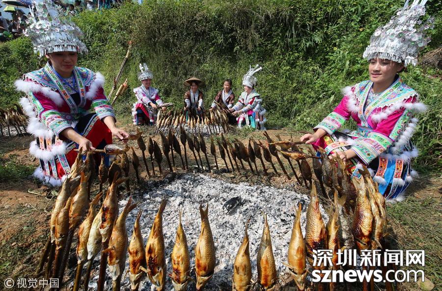 廣西柳州市融水縣山區(qū)有插秧時(shí)節(jié)放養(yǎng)鯉魚苗的習(xí)俗,金秋時(shí)節(jié)稻熟魚肥,收稻燒魚成為別致一景。
