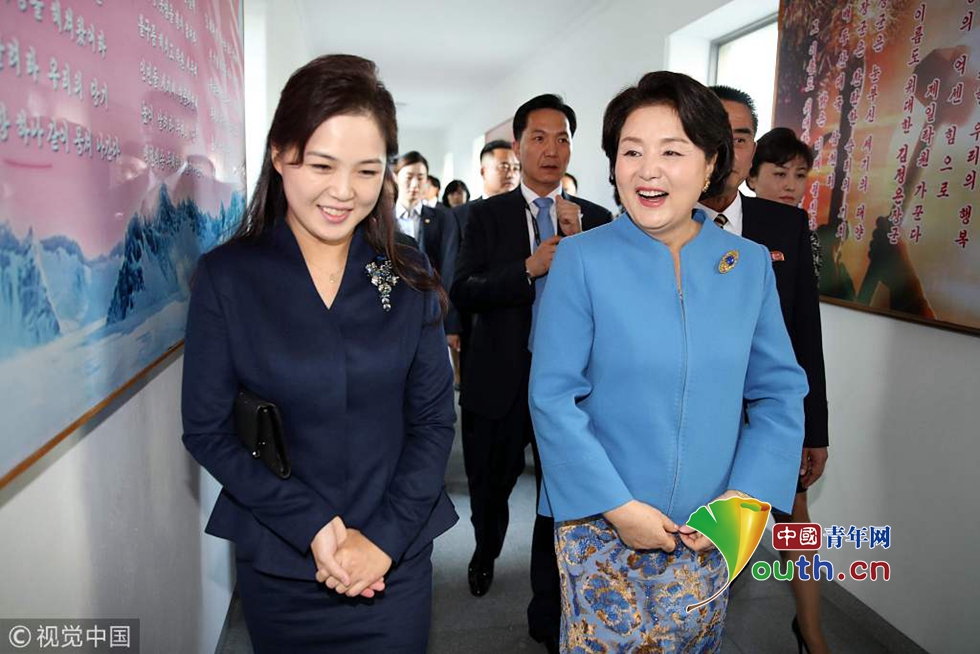 當(dāng)?shù)貢r(shí)間2018年9月18日,朝鮮平壤,韓國總統(tǒng)文在寅夫人金正淑在朝鮮國務(wù)委員會(huì)委員長(zhǎng)金正恩夫人李雪主的陪同下參觀平壤金元均音樂大學(xué)。圖片作者:視覺中國