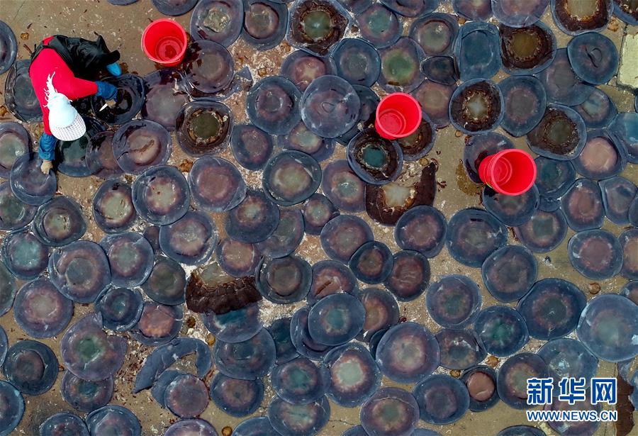 9月21日,灤南縣南堡鎮(zhèn)南堡二村一家海蜇養(yǎng)殖場的工人在海蜇鹵制池內(nèi)擺放海蜇(無人機拍攝)。新華社記者楊世堯攝