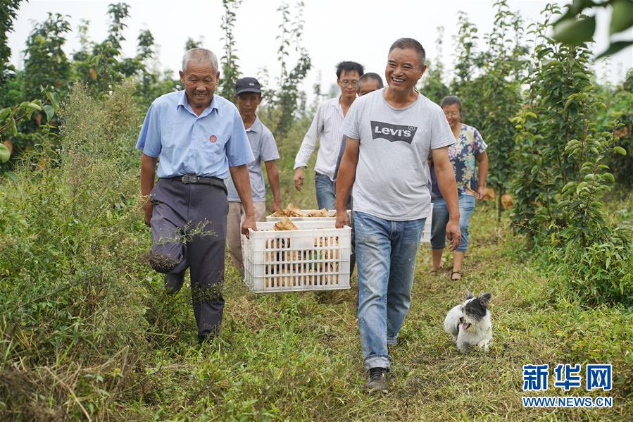 9月16日,小崗村梨園公社種植基地負(fù)責(zé)人黃慶昶(前右)與村民一同采摘“大吉梨”。新華社記者才揚(yáng)攝