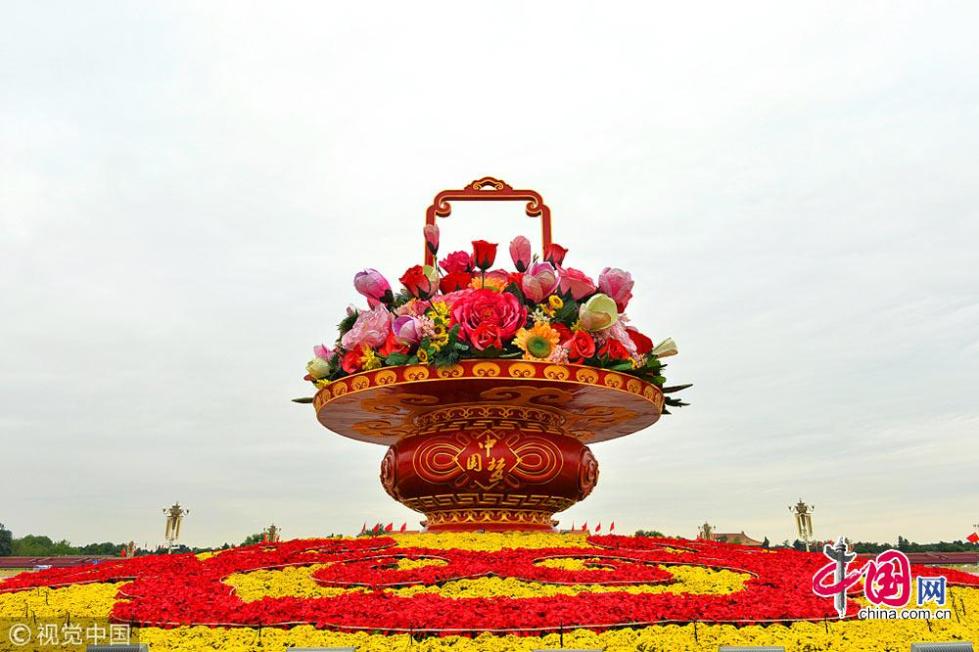 2014年國(guó)慶花卉布置中首次使用了3D打印技術(shù),花壇造型更加豐富逼真。大花籃里的“花材”主要選用牡丹、月季、玉蘭、芙蓉、向日葵等,這些“花材”,里面都是金屬結(jié)構(gòu),外面是經(jīng)過處理的織物。其中牡丹最大,直徑3.2米,花頭單重300公斤,花籃里共有八九枝這樣的大牡丹,是花籃中的“主花”。 花籃中還有月季、玉蘭、芙蓉等傳統(tǒng)花材的模型,也有部分鮮花。整個(gè)花籃完成后,直徑50米,籃盤直徑15米,頂高15米,非常有氣勢(shì)。花籃籃體增加了中國(guó)結(jié)圖案,四周都嵌有“中國(guó)夢(mèng)”字樣,均為燈箱效果,突出強(qiáng)調(diào)祝福祖國(guó)、實(shí)現(xiàn)中國(guó)夢(mèng)的美好意愿。