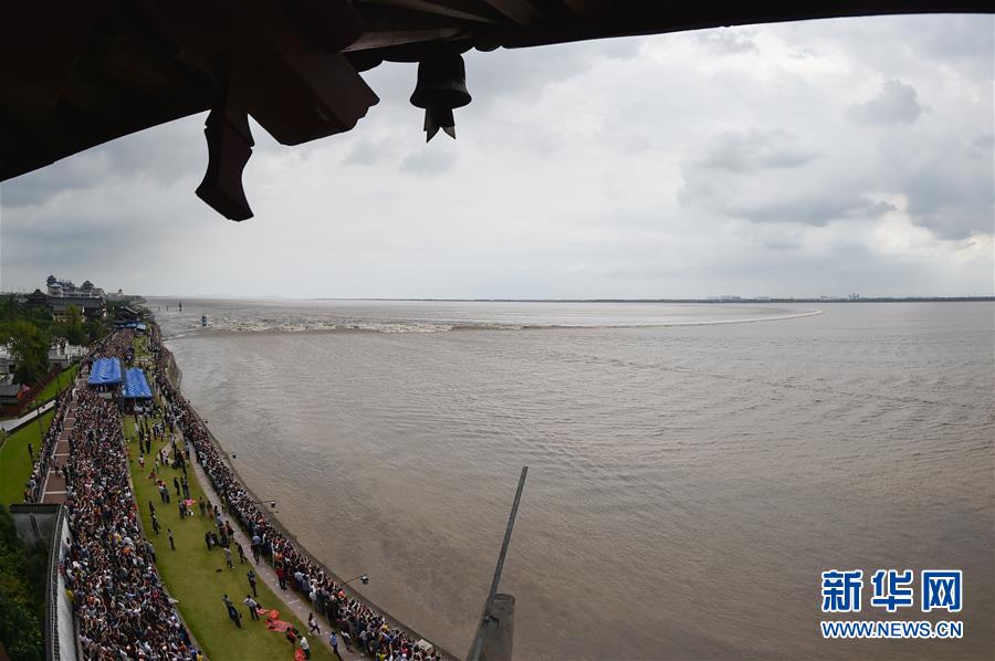 9月27日,人們在浙江海寧市鹽官鎮(zhèn)觀看錢塘江大潮。當(dāng)日是農(nóng)歷八月十八,號稱“天下第一潮”的錢塘江大潮洶涌而來,眾多錢塘江沿岸居民和游客爭睹其壯觀景象。新華社記者 黃宗治 攝