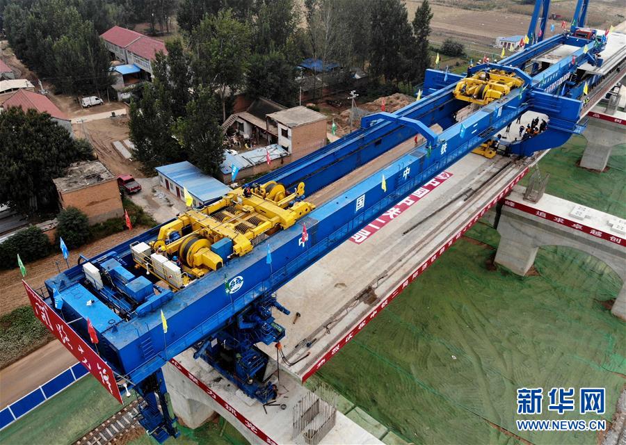 9月27日,中鐵二局的施工人員使用大型機械在鄭(州)濟(南)高速鐵路(鄭濮段)站前工程VI標施工現(xiàn)場架設40米簡支箱梁(無人機拍攝)。 新華社記者李安攝