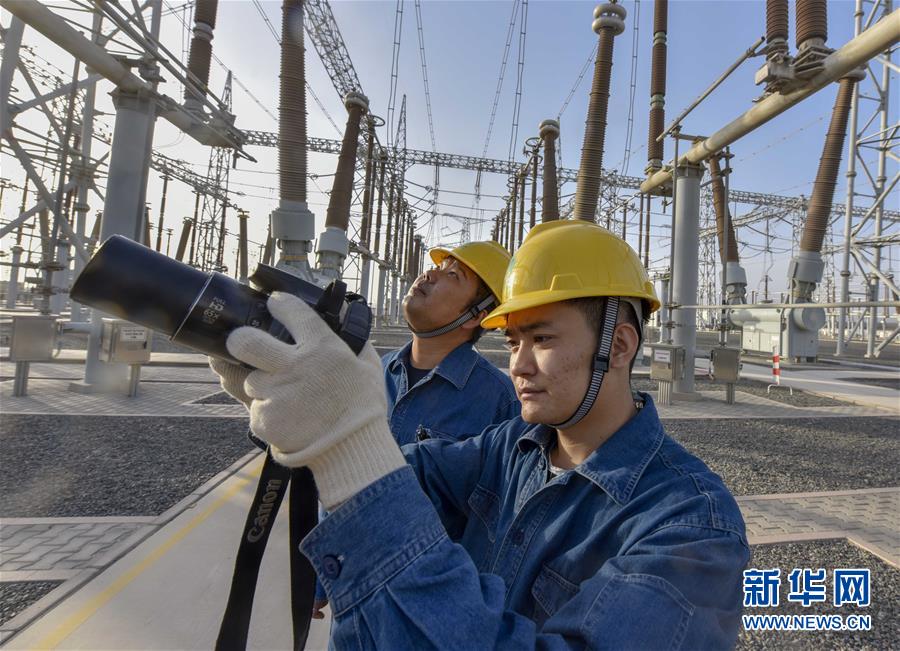 在吐魯番市750千伏變電站,兩位工作人員利用專用設(shè)備對(duì)電力設(shè)施進(jìn)行檢查(9月18日攝)。新華社記者趙戈 攝