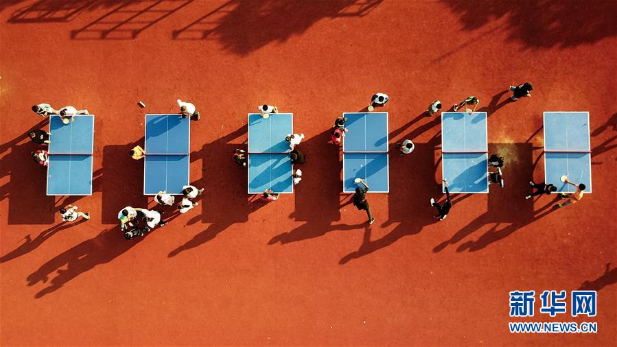 學(xué)生在安徽鳳陽(yáng)小崗村小崗學(xué)校內(nèi)打乒乓球(9月26日無(wú)人機(jī)拍攝)。 新華社記者 張端攝