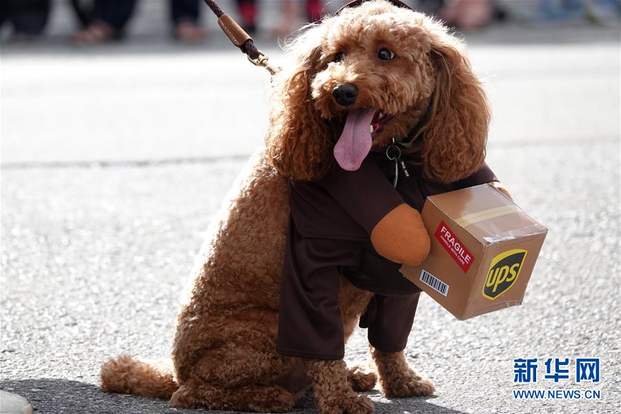 9月29日,在美國加利福尼亞州伯林蓋姆市,一只寵物狗參加大游行活動。美國加州舊金山灣區(qū)的伯林蓋姆市29日舉行寵物狗大游行活動。新華社記者吳曉凌攝