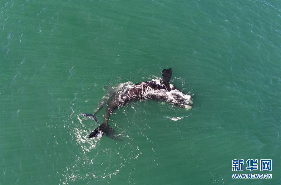 9月30日,在南非赫曼紐斯小鎮(zhèn)附近海面上,2頭南露脊鯨在海岸邊暢游。9月29日,位于開普敦以東約115公里的赫曼紐斯小鎮(zhèn)迎來2018年的鯨魚節(jié),來自世界各地的游客可乘船出海觀鯨,也可在岸邊等待鯨魚的到來。新華社記者陳誠攝
