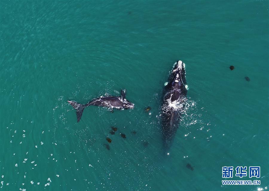 9月30日,在南非赫曼紐斯小鎮(zhèn)附近海面上,南露脊鯨在海岸邊暢游。9月29日,位于開普敦以東約115公里的赫曼紐斯小鎮(zhèn)迎來2018年的鯨魚節(jié),來自世界各地的游客可乘船出海觀鯨,也可在岸邊等待鯨魚的到來。新華社記者陳誠攝