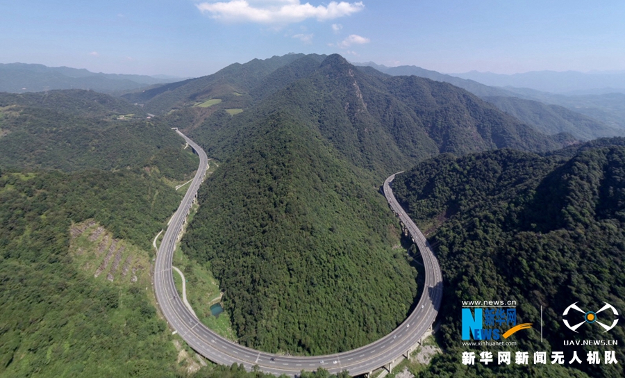 拼接照片:這是廈蓉高速長下坡龍巖路段的道路景觀,高速在群山中穿行。改擴建工程竣工之后,長下坡將改成上行線,變?yōu)樯掀侣范危o人機拍攝)。新華網(wǎng) 肖和勇 攝