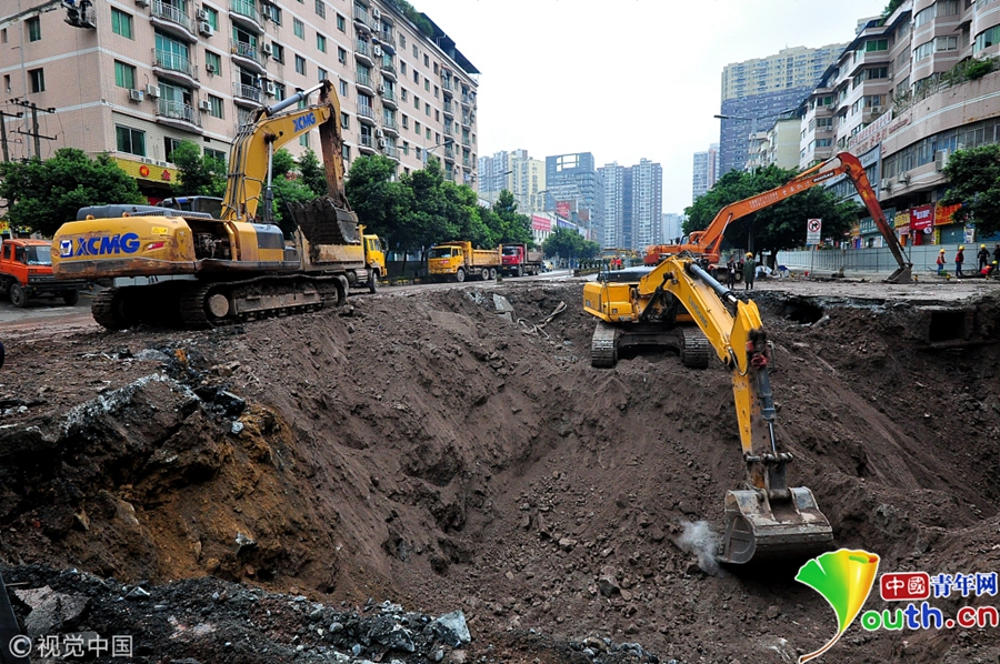 中國青年網(wǎng)北京10月9日電 2018年10月8日消息,四川達(dá)州。10月8日從四川省達(dá)州市達(dá)川區(qū)委宣傳部獲悉,7日14時(shí)30分左右,達(dá)川區(qū)東環(huán)南路103號人行道路面發(fā)生塌陷險(xiǎn)情,經(jīng)調(diào)取視頻監(jiān)控和走訪周邊群眾,救援人員初步判斷疑似有4人掉入坑中。圖片作者:視覺中國