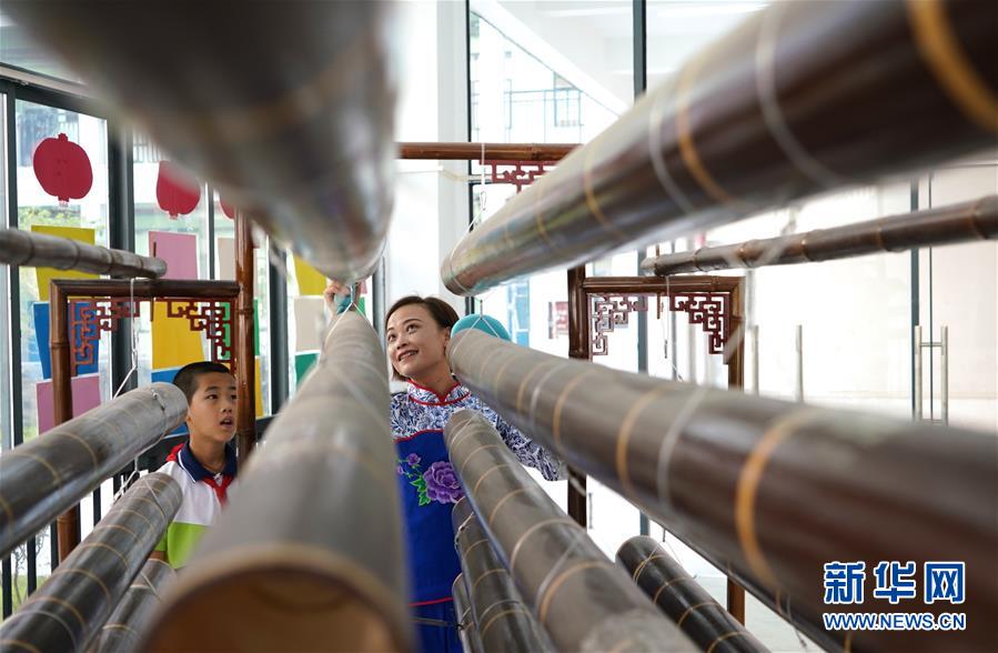 10月8日,崇義縣竹樂(lè)樂(lè)團(tuán)的演員在教學(xué)生演奏竹排琴。 近年來(lái),江西省崇義縣思源實(shí)驗(yàn)學(xué)校定期開(kāi)設(shè)竹樂(lè)課,邀請(qǐng)崇義縣竹樂(lè)樂(lè)團(tuán)的演員教授學(xué)生演奏竹排琴、竹板琴等竹樂(lè)樂(lè)器,激發(fā)學(xué)生了解傳統(tǒng)文化的熱情。 新華社記者胡晨歡攝