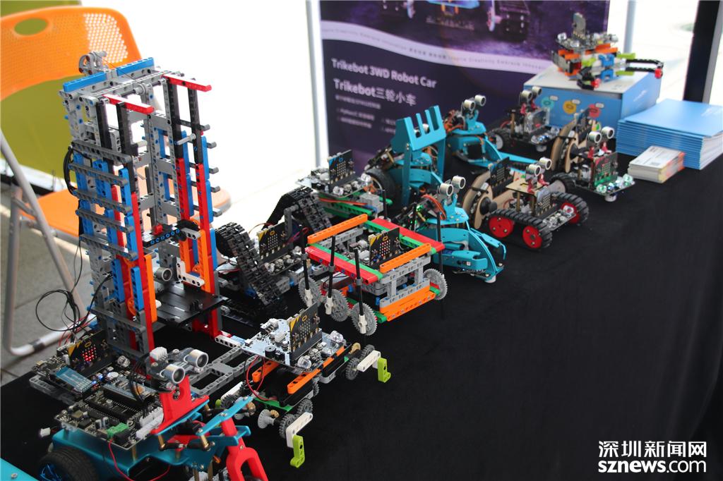 針對小朋友教育的小機器人可以自行組裝、編程,圖為展位前的教育小機器人