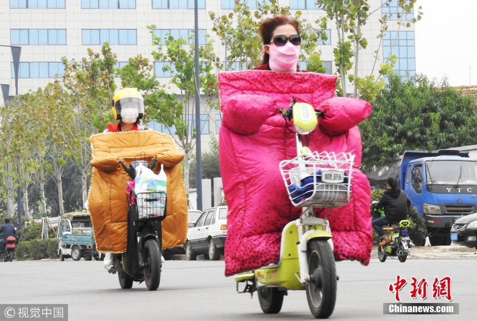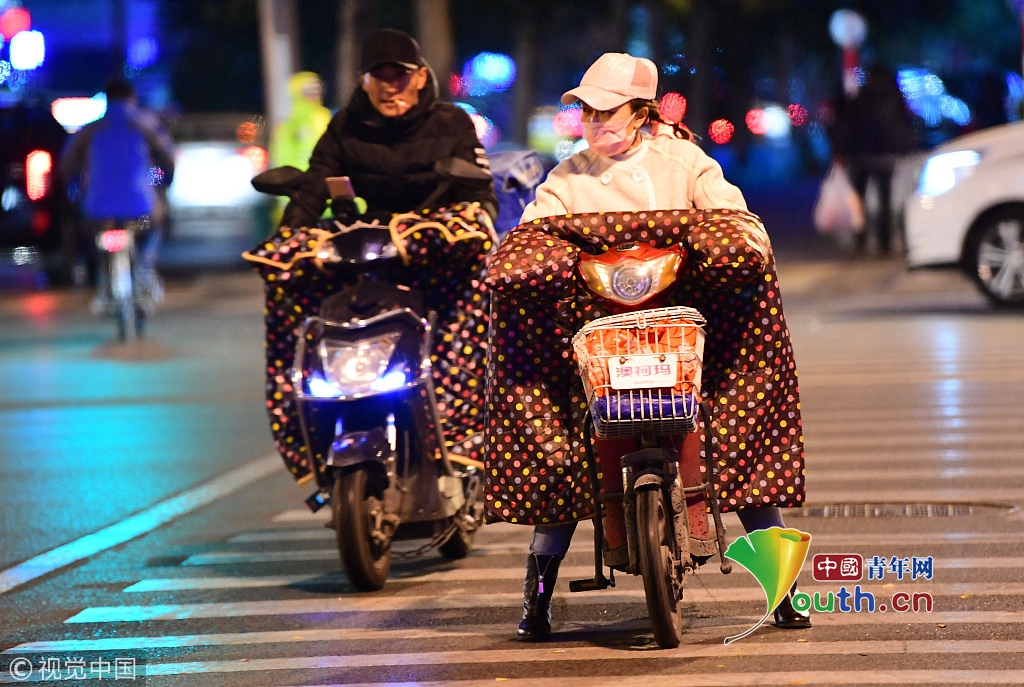 2018年10月9日,山東濟(jì)南,昨日一場秋雨過后開始降溫,今天清晨最低氣溫只有6度,馬路上不少上班族穿上羽絨服騎車趕上班路。 圖片來源:視覺中國