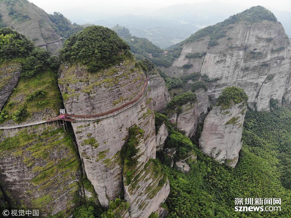 深圳新聞網(wǎng)訊 2018年6月19日,航拍江西贛州南武當(dāng)山百米高空玻璃棧道。棧道緊貼峭壁,在懸崖之上凌空蜿蜒穿行,猶如一條玉龍盤旋在綠林石海之中。 南武當(dāng)山位于江西最南端的龍南縣武當(dāng)鎮(zhèn)境內(nèi),景區(qū)核心面積達(dá)到13.5平方公里,擁有99座千姿百態(tài)的巍峨石峰,丹霞地質(zhì)風(fēng)貌突出,連綿十里,被稱為“武當(dāng)十里畫廊”。