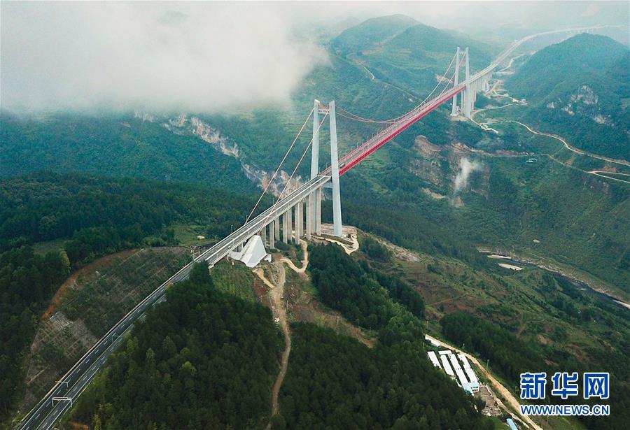 貴陽(yáng)至甕安高速公路上的清水河大橋(8月27日無(wú)人機(jī)拍攝)。該橋主跨1130米,是世界上最大單跨板桁結(jié)合加勁梁懸索橋。新華社記者劉續(xù)攝