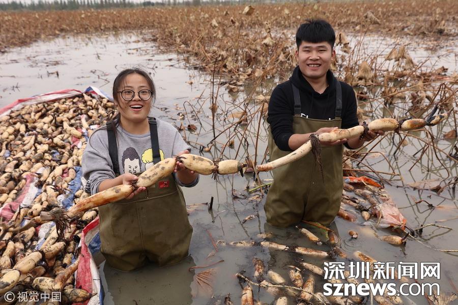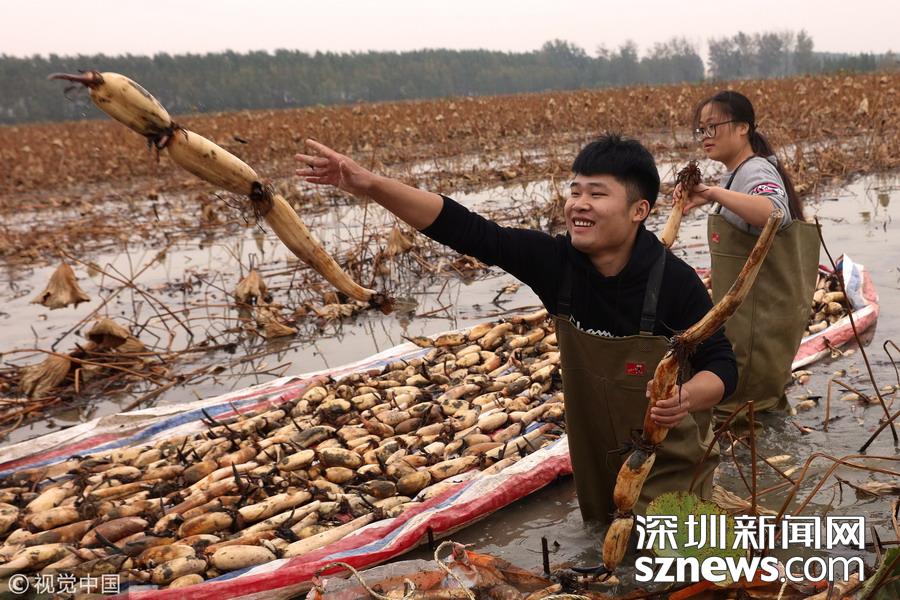 深圳新聞網(wǎng)訊 2018年10月14日,在江蘇宿遷泗洪縣曹廟鄉(xiāng)瓦廟村藕蝦共作基地,一場(chǎng)以藕為主題的慶祝豐收活動(dòng)正在舉行。充滿農(nóng)趣的挖蓮藕、選藕王、挑蓮藕、切藕片等比賽活動(dòng),吸引當(dāng)?shù)剞r(nóng)民積極踴躍參與,切身感受到了豐收帶來(lái)的喜悅。